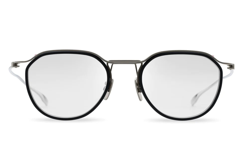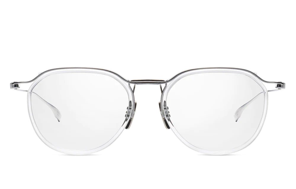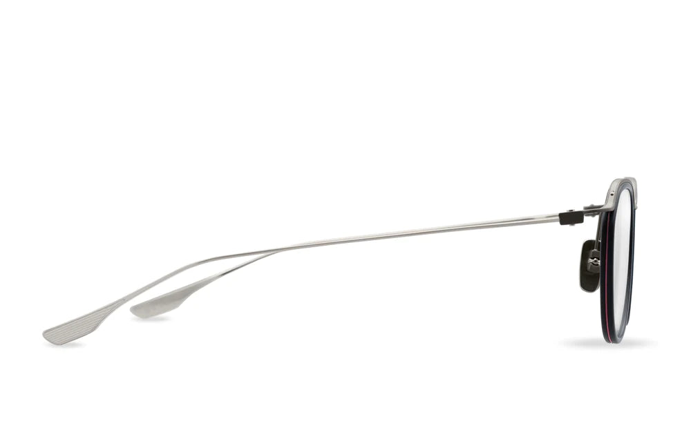 A titanium frame that features thin acetate lens inserts in a round lens shape. Elimination of screws reduces mechanical friction and ensures that no specialized tools are required in the assembly process.